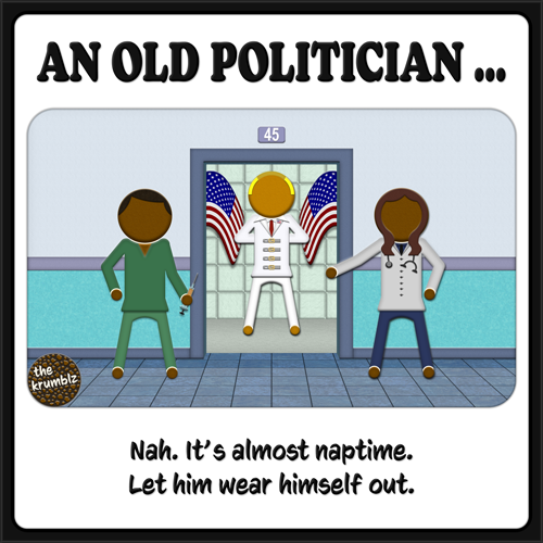 Fading, fading ... fading. Not! An old soldier. Those darn bone spurs! Anyways. While I am enjoying the rambling, incoherent videos – is there not one person in what's left-of-his-life that can save him from himself? Well, somebody NOT named in the will. Because THAT is a conspiracy theory you can take to the bank. Literally.