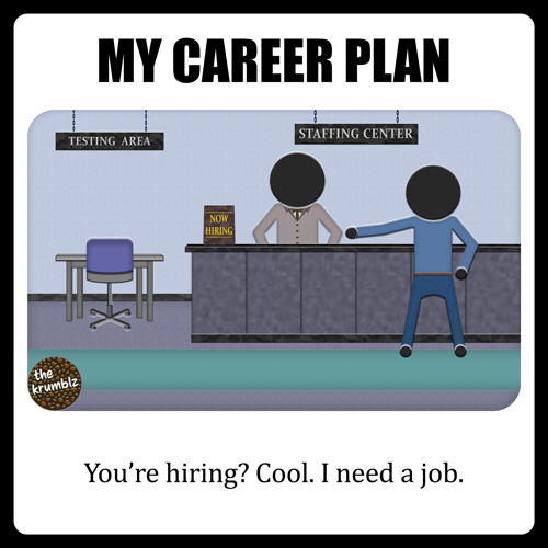 My career plan? I was fired for leaving work to "save" a girlfriend that attempted suicide. The rusty pair of scissors to my stomach was a bonus. So. Next morning, I accepted a temp position I was offered the prior week.