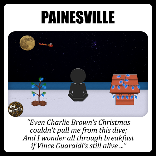 Christmastime in Painesville by Slack Jaw. 1995. Newly single. Driving I-90W to work, it came on the radio passing under the exit 185 ... signs. West to Cleveland? East to Painesville? I laughed. As I healed. From? Scissors.