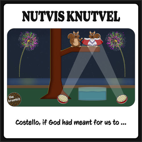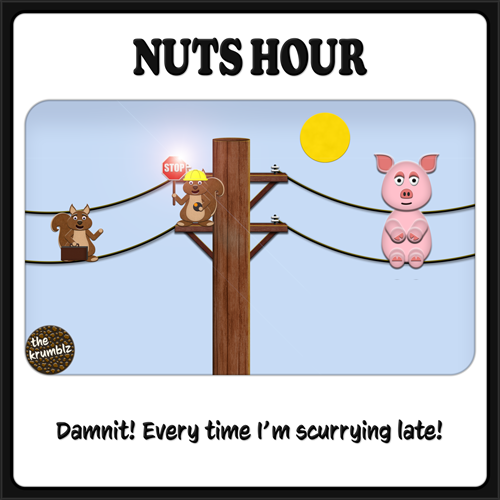 (b) Squirrelly Sunday! When is “nuts hour”? Well. I guess that is a question best answered by … look a dog! Wait. Fiery flames nah way. It’s a … pig? Now how the bleepity bleep bleep did HE get up there? No. Don’t tell me …